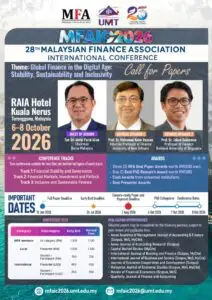 The Malaysian Finance Association International Conference 2026 (MFAIC2026) proudly welcomes academics, researchers, policymakers, and industry professionals from around the world to convene in Kuala Terengganu, Malaysia, on 6–8 October 2026, for an intellectual gathering that promises to shape the future of financial thought and practice.
